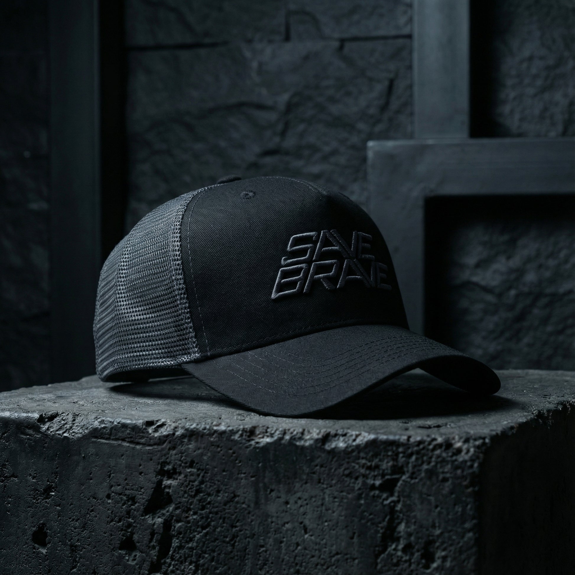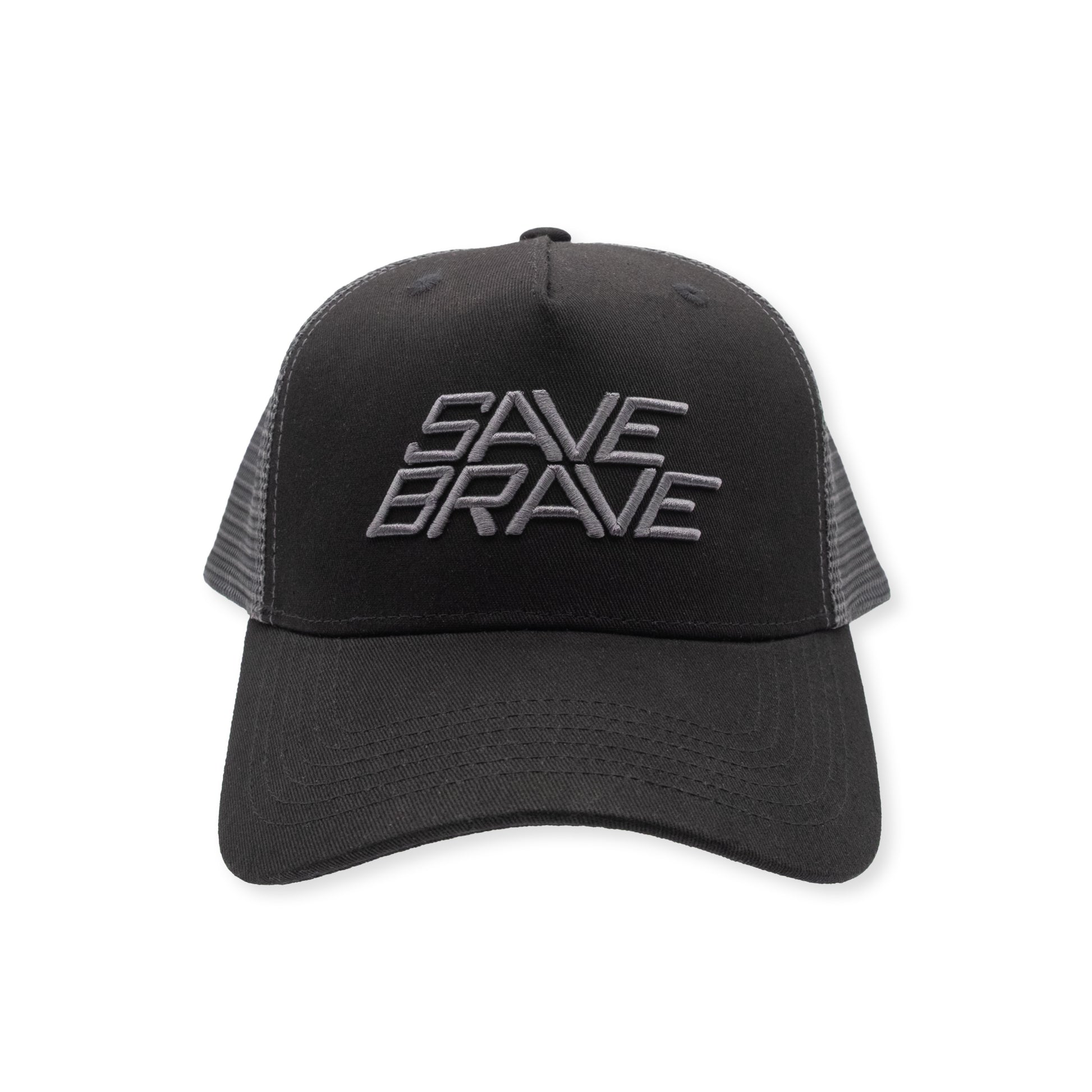 Schwarze Trucker Cap mit grauer „Save Brave“-Stickerei auf der Vorderseite und grauem Mesh auf der Rückseite für optimale Belüftung. Dank Snapback-Verschluss größenverstellbar und bequem anpassbar. Ideal für Alltag, Freizeit oder Outdoor-Aktivitäten – ein stylisches Accessoire mit Statement.